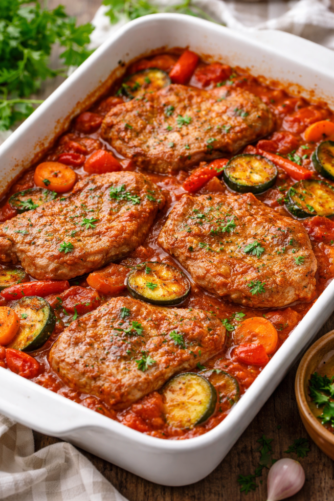 Ove svinjske šnicle kuvane u domaćem mlevenom paradajzu, sa obiljem povrća i belog luka, upravo su takav obrok – jednostavan, ali nutritivno vredan.